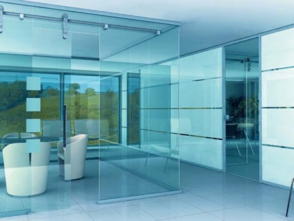 Безрамные стеклянные противопожарные перегородки могут изготавливаться как в полностью остекленном варианте, так и в частично остекленном исполнении. Основное предназначение таких конструкций — это разделение общего помещения на несколько отдельных рабочих зон. При этом преследуется несколько целей: