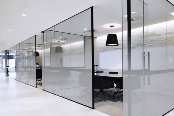 Матовые стеклянные противопожарные перегородки могут изготавливаться как в полностью остекленном варианте, так и в частично остекленном исполнении. Основное предназначение таких конструкций — это разделение общего помещения на несколько отдельных рабочих зон. При этом преследуется несколько целей: